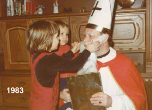 willigte ein und kam als Nikolaus verkleidet mit weißer Albe und festlichem Rauchmantel aus dem